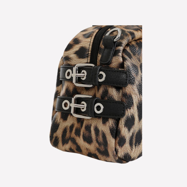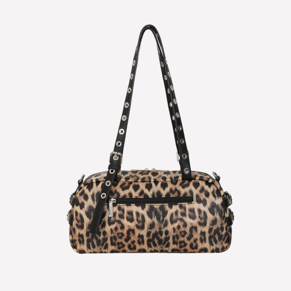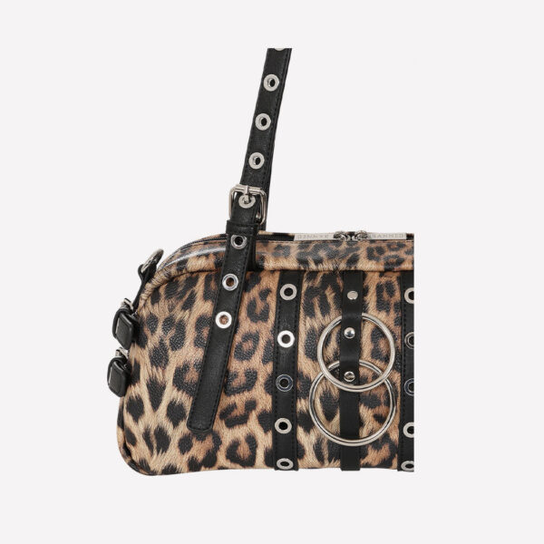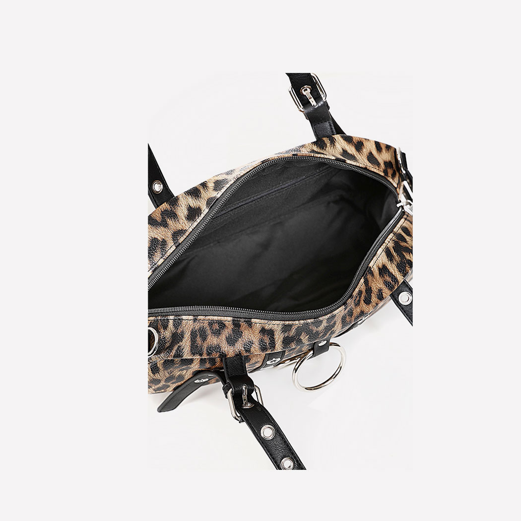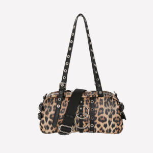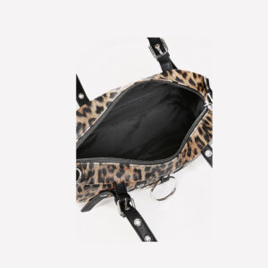 BOLSO LEOPARD HEXY GLAM . Elegante bolso de mano con forma de barril de BANNED Apparel con un atrevido estampado de leopardo y detalles de piel sintética negra. Este versátil bolso cilíndrico luce sus distintivas anillas dobles y detalles de ojales en las correas y el panel frontal. Su práctico diseño incluye asas superiores ajustables y una correa de hombro tejida desmontable para múltiples opciones de transporte. Su silueta de barril combina moda alternativa con un diseño funcional, lo que lo hace perfecto tanto para el día a día como para un estilo con personalidad. Producto de Importacion.