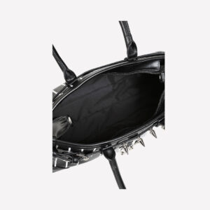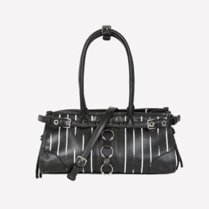 BOLSO THORNE GOTHIC BLACK/WHITE – Realza tu estilo gótico con el bolso Thorne de piel vegana de BANNED. Diseño clásico de raya diplomática con detalles de piercings plateados, correas ajustables y una artesanía de primera calidad. Producto de Importacion.