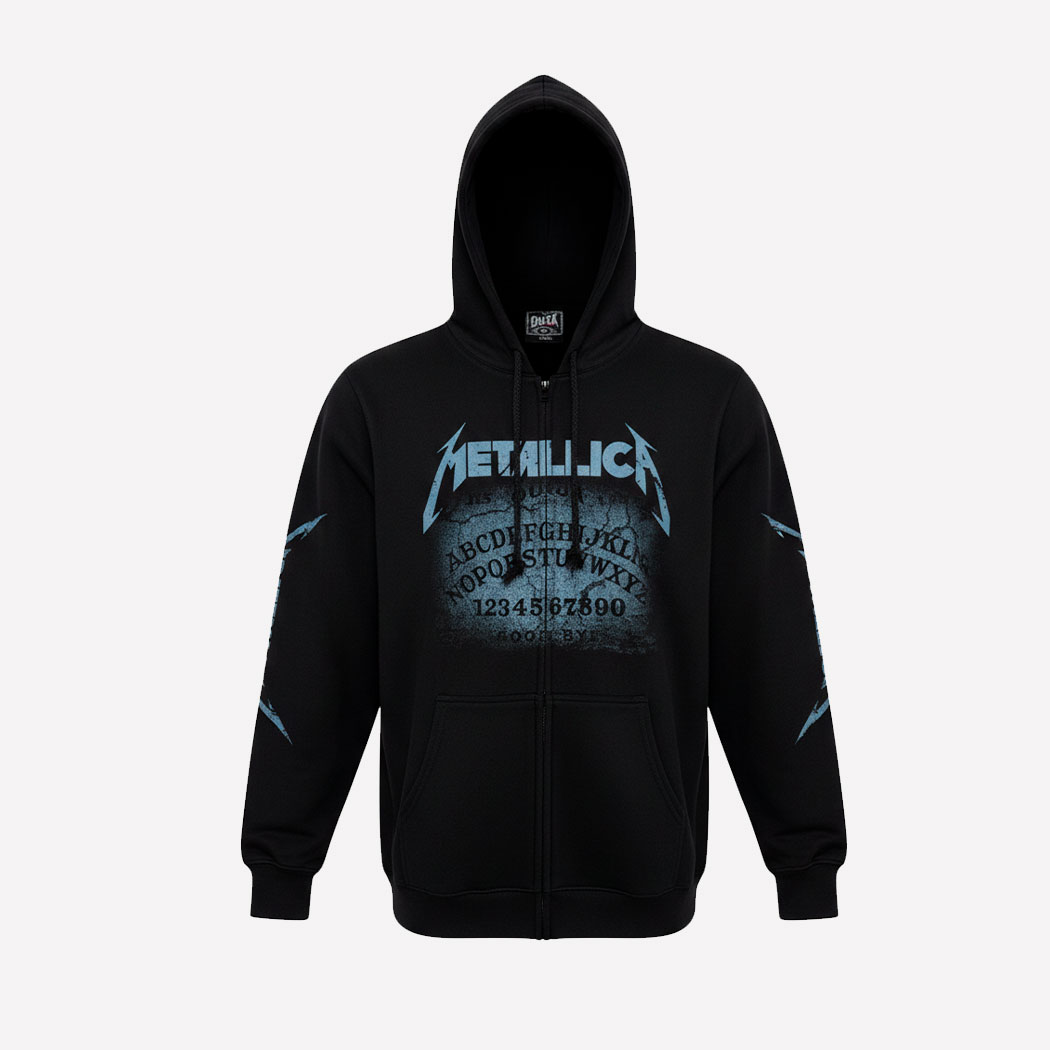 SUDADERA CREMALLERA METALLICA HAMMETT OUIJA GUITAR . Impresa de Gran Calidad por Ambos Lados y Mangas. Bolsillos Delanteros. Capucha con Cordon. Unisex. Producto de Importacion.